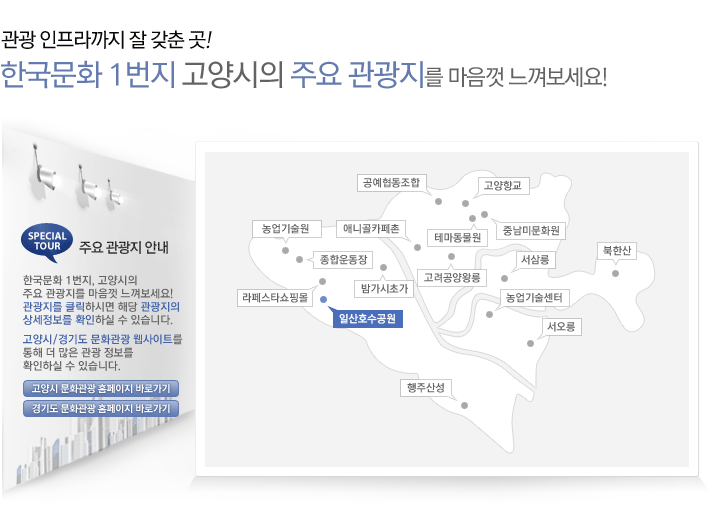 | 일산 호수공운은 장항동 일대에 소재한 국내 최대규모의 인공호수공원으로 호수면적 9만 1천평, 공원 총 면적 31만 3천 평으로 아름답고 깨끗한 수도권 명소로 알려져 있다. 특히 호수를 중심으로 한 4.7km의 자전거 도로와 5.8km의 산책로는 고양시민들의 운동장소로 각광받고 있으며, 또한 고양세계꽃 박람회 등 국내외 문화 행사와 축제가 개최되고 있어 공원을 방문한 모든 사람들에게 사랑을 받고 있다. |